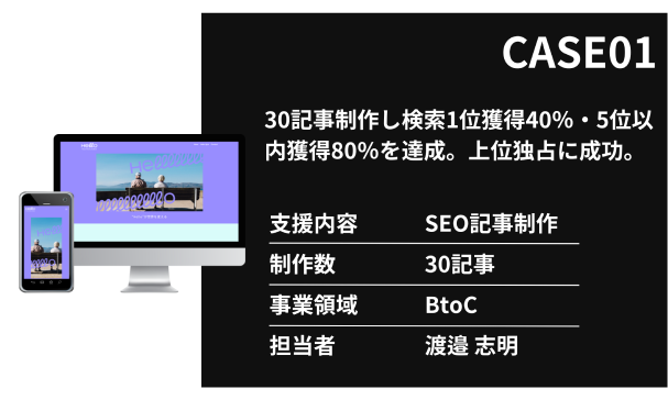 小規模サイトで制作した記事のほとんどが上位に。30記事制作し検索1位獲得40%・5位以内獲得80%を実現
