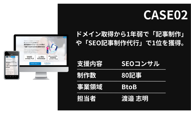 ドメイン取得から1年かからずに「記事制作」や「SEO記事制作代行」で1位を獲得。自社のSEOでも躍進中。