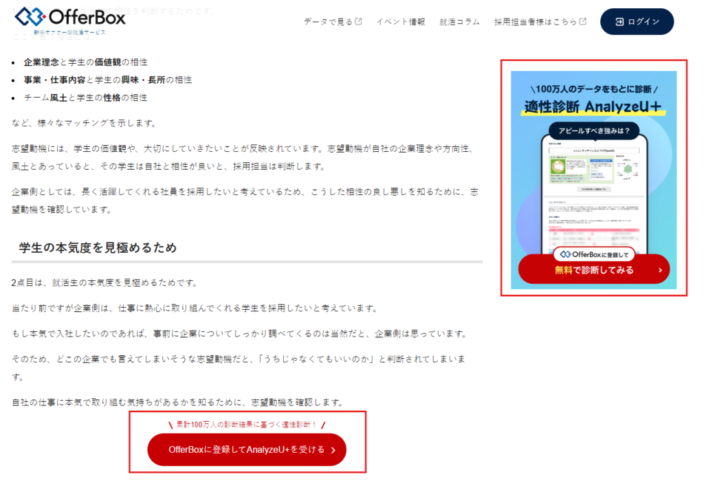 そこで、以下のように「志望動機 決め方」の記事内に、無料適正診断サービスへの誘導を追加しています。