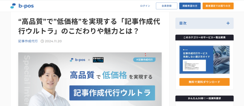 当社代表の渡邉志明が、人気の記事制作会社の代表取締役として、BPO比較サイト「b-pos」の取材を受けました。 記事内では、SEO記事制作代行サービス「記事作成代行ウルトラ」 のこだわりや魅力について語っています。 ▼記事はこちら 高品質”で”低価格”を... -