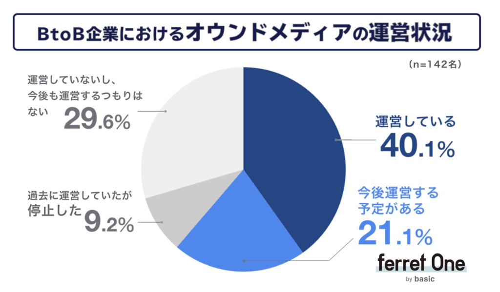 Webマーケティングツールを提供する株式会社ベーシックが、BtoB企業を対象に「オウンドメディアの運営状況に関する調査」を実施したところ、オウンドメディアを運営していると答えたBtoB企業は、40.1%との結果が出ています。