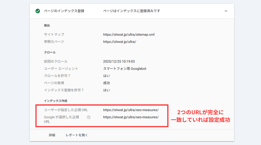 この2つのURLが完全に一致していれば、設定は成功です。あなたの指示通りにGoogleが正規化を受け入れています。