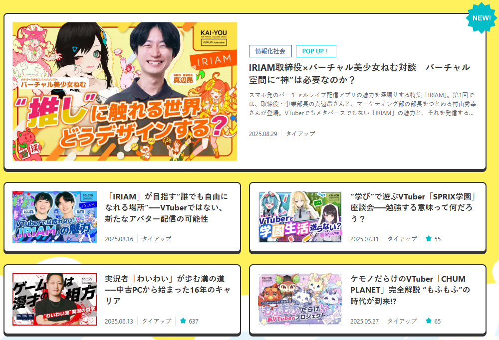 KAI-YOUは、文芸・アニメ・漫画・イラスト・ゲーム・音楽・ITなど、ポップカルチャーを横断的に発信するメディアです。