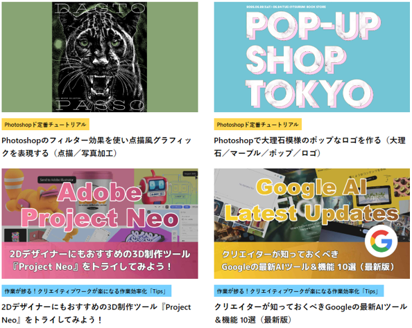 アイキャッチ画像は、PhotoshopやIllustratorなどのツール活用例や最新テクノロジーをテーマに、ビジュアルインパクトを前面に押し出しています。
