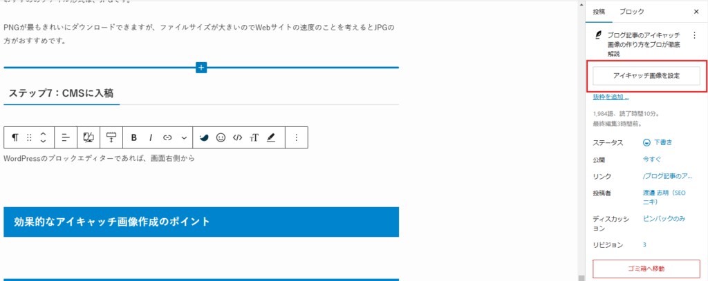 WordPressのブロックエディターであれば、画面右側からアイキャッチ画像が追加できます。