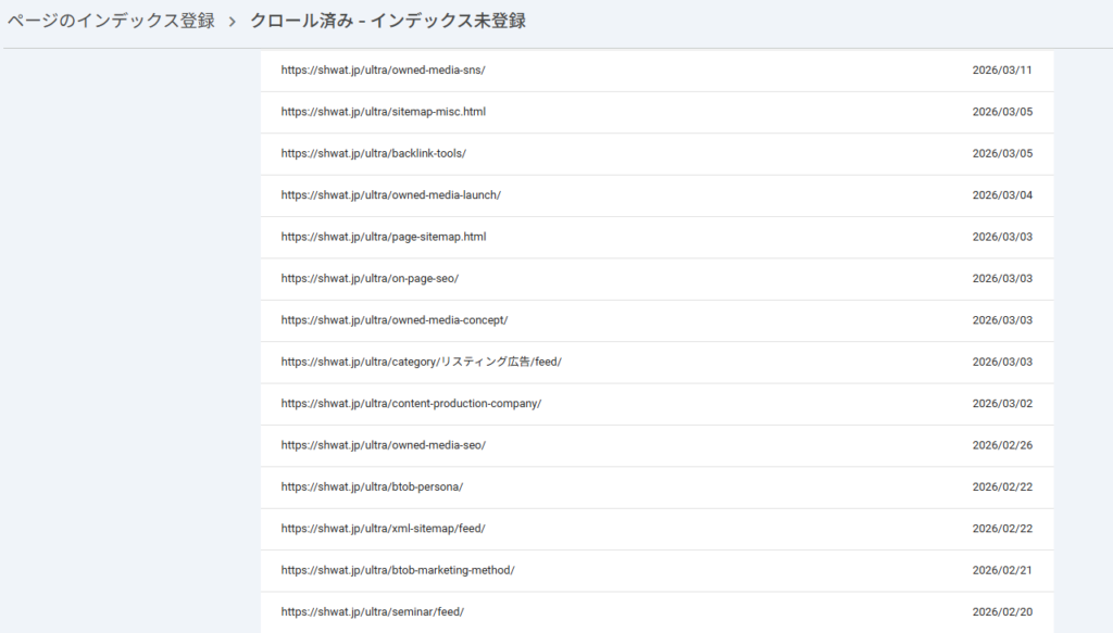 特に「除外」と表示されているページ(グレーの項目)は、検索結果に出す必要がない管理画面や、自動生成されたページなどが含まれているケースが多く、そのままで問題ありません。