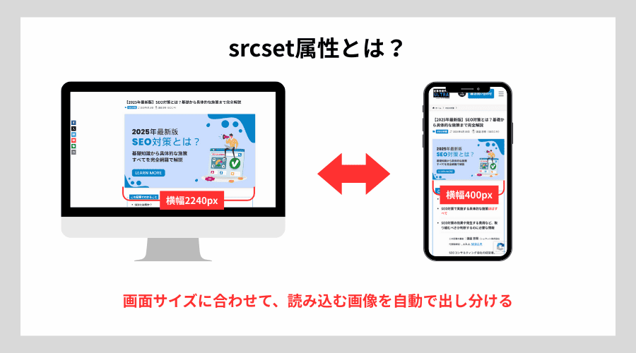 srcset(ソースセット)属性とは、閲覧者の画面サイズ(PCかスマホか)に合わせて、読み込む画像を自動で出し分けるための設定です。