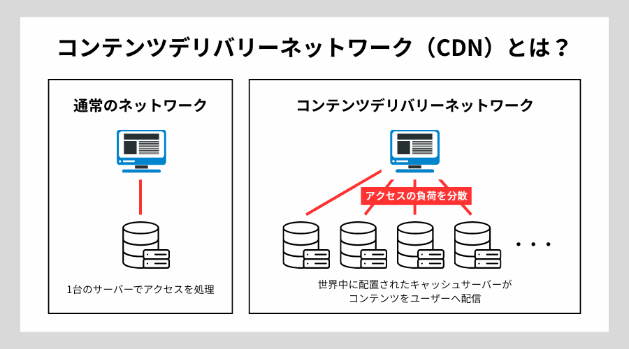 また、通常は1台のサーバーですべてのアクセスを処理しますが、CDNを使えば負荷を分散させることができます。