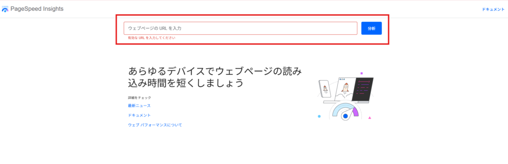 画面中央の検索ボックスに調べたいページのURLを入力し、分析をクリック。