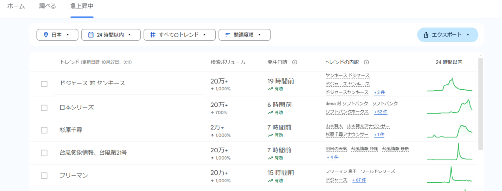 上記は2024年のワールドシリーズ一戦目でフリーマン選手が逆転満塁ホームランを打った日のデータです。このように、Googleトレンドは楽しいツールなので業務中ということを忘れてずっと見てしまいがち。その点には気を付けてください(笑)