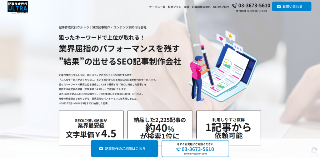 シュワット株式会社が提供する「記事作成代行ウルトラ」は、記事LPを含むWebコンテンツ制作において、国内トップクラスの実績とノウハウを持つ、業界屈指の人気を誇る記事制作代行サービスです。