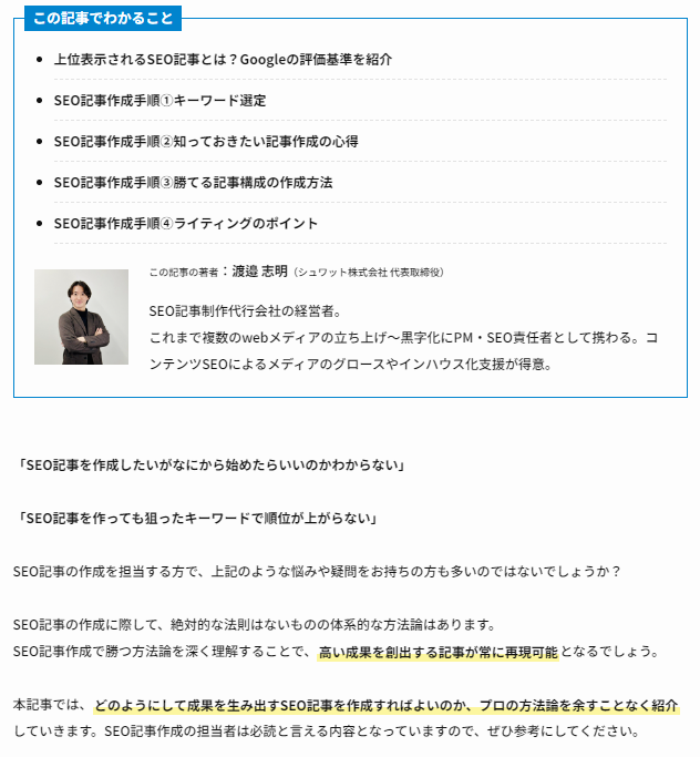 例えば、弊社の記事でも、リード文では、著者がその分野に詳しいことや、プロフィールを示すことで、信頼性を高めています。