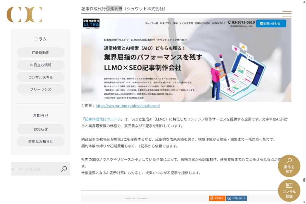 コンサル案件.comに、弊社がおすすめのSEO記事制作会社として掲載されました。