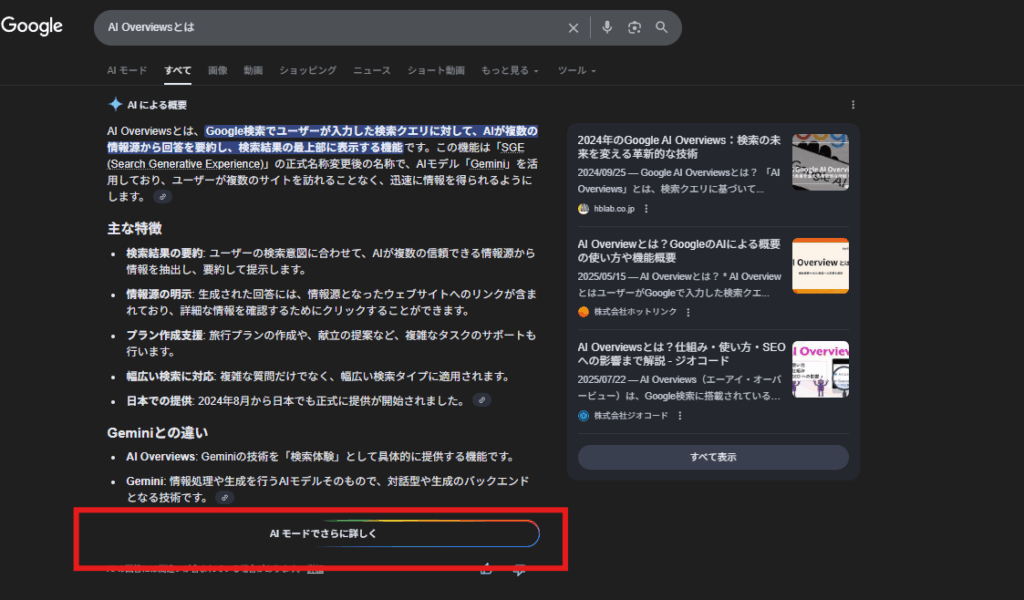 AI Overviewsと似たものとして挙げられるのが、2025年9月にGoogleに実装された「AIモード」です。