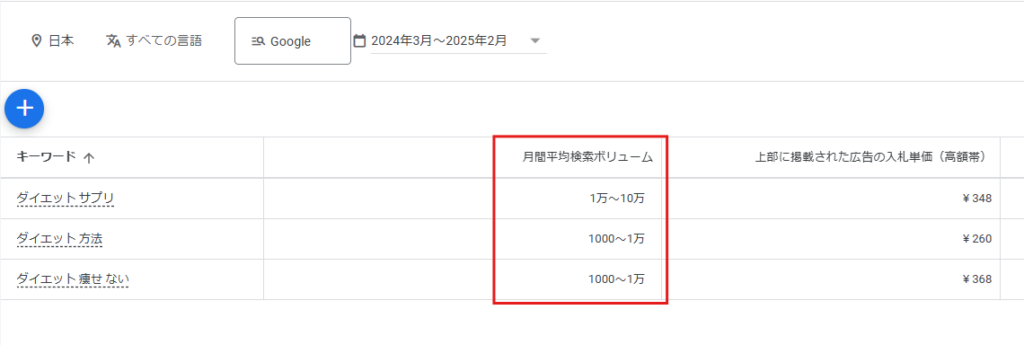 無料利用だと、上図のよう1000~1万というようにざっくりとした検索ボリュームのみが表示され、Google広告を一定金額以上配信すればより正確な数値が表示されます。