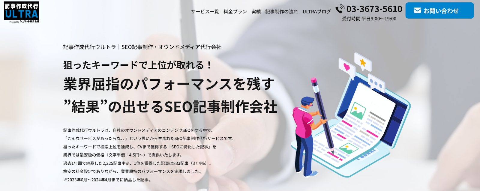 SEOコンテンツ制作代行サービス「記事作成代行ウルトラ」からスタートしたシュワット株式会社なら、戦略設計〜コンテンツ制作までをまとめて依頼できます。そのためスピード・費用面の満足度も高めやすいです。