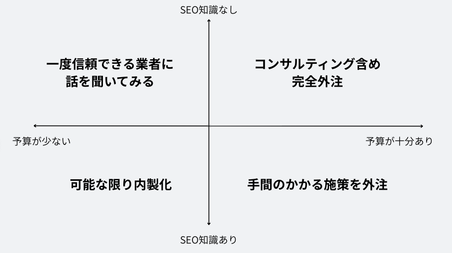 外注と内製のバランスをとることで、効率よく作業を進められます。また、一部を内製化することで、SEO対策のノウハウが社内に蓄積され、将来的には完全内製化も目指せます。そのため、内製化をサポートするSEO対策会社に一部を外注するのがよいでしょう。