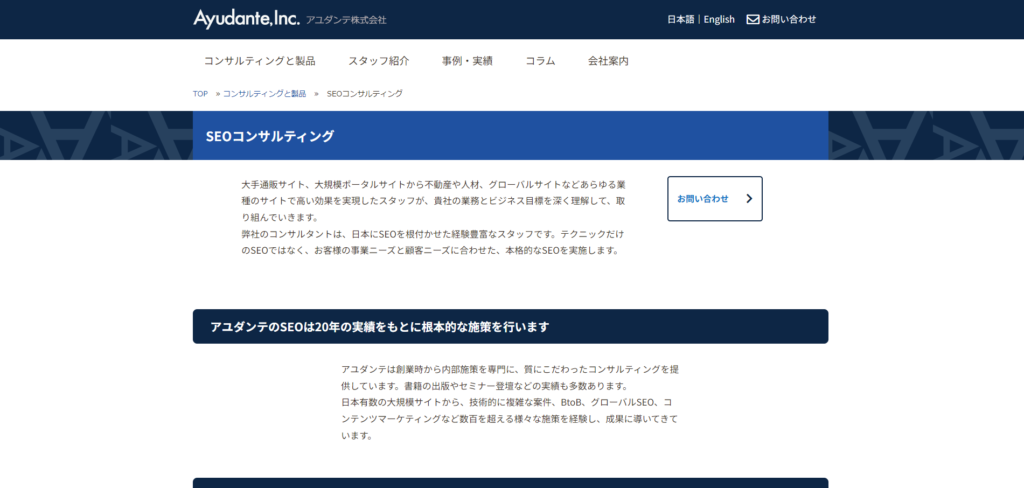 | サービス内容 | SEOコンサルティング キーワード戦略設計 各種コンテンツ制作代行 CVR改善コンサルティング |